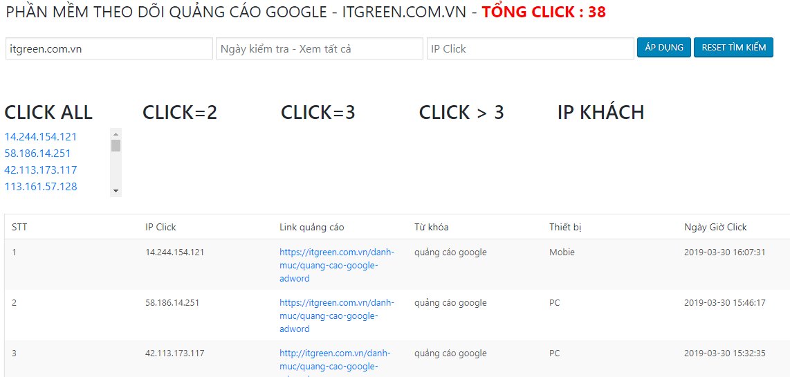 Đặc biệt khi quảng cáo tại ITGreen khách hàng được theo dõi số lượng click quảng cáo theo thời gian thực từ phần mềm do ITGreen cung cấp.